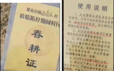 “持证春耕”——这样的事可谓亘古未有,即便4月21日两部委就已经下发通知,“严禁以防疫为由不让农民下地”,但是,从磁县的情形看,这样的通知似乎并没真正地被发下去。