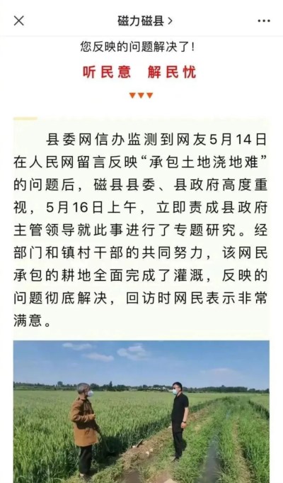 磁县县委、县政府高度重视,5月16日上午,立即责成县政府主管领导就此事进行了专题研究。经部门和镇村干部的共同努力,该网民承包的耕地全面完成了灌溉,反映的问题彻底解决,回访时网民表示非常满意。