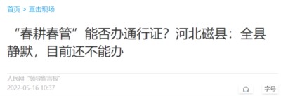 5月14日13时45分,河北省邯郸市磁县有网友在人民网“领导留言板”留言,问“春耕春管”能否办通行证,磁县县委办公室社情民意办5月15日上午10点28分左右回复称: