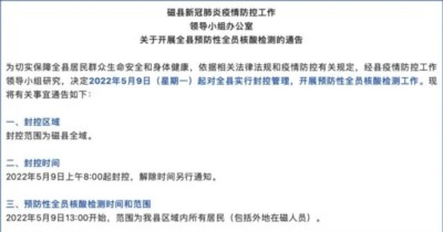 可5月9日,磁县发布通知,决定从即日起对全县实行封控管理。