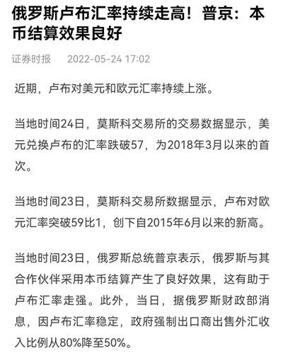 卢布对美元欧元的升值一路高歌,升值意味着什么呢?意味着欧美购买俄罗斯的东西,需要付出更多的美元欧元,也就是价格越来越高。因为俄罗斯要求卢布结算,卢布定价的价格是不变的,但是卢布升值会在卢布价格不变的情况下,让欧美付出更多的美元欧元。