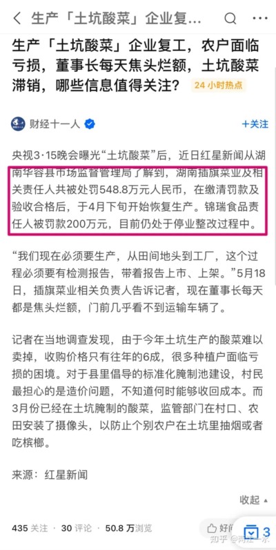 土坑酸菜被央视曝光后,湖南插旗菜业及相关责任人共被处罚548.8万元人民币,不过在缴清罚款及验收合格后,已经于4月下旬开始恢复生产。