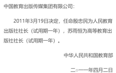 殷社长历任教育编辑室副主任、《课程·教材·教法》编辑部副主任、人民教育出版社报刊社副社长、人事处副处长、经营管理办公室主任、社长助理、副社长兼人民教育电子音像出版社社长、人民教育出版社社长(2011-2015)、中国教育出版传媒集团有限公司总经理(2015-2021)。2021年9月16日退休[6]。