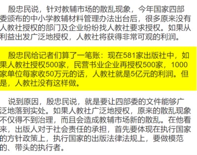 但这件好事情,又造成了人教社和高教社的垄断地位。刚刚改制的人教社手握教材版权,自然成了香饽饽,利润的大门向人教社打开了。
