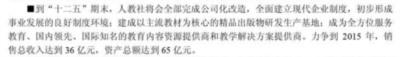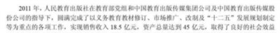 人民教育出版社在2011年完成小改制,从事业单位改制成为企业单位,在2011年,实现销售收入18.5亿元,资产总量45亿元。(来源:面对机遇与挑战,人教社绘就“十二五”构想[8])