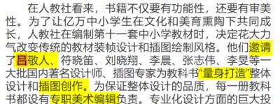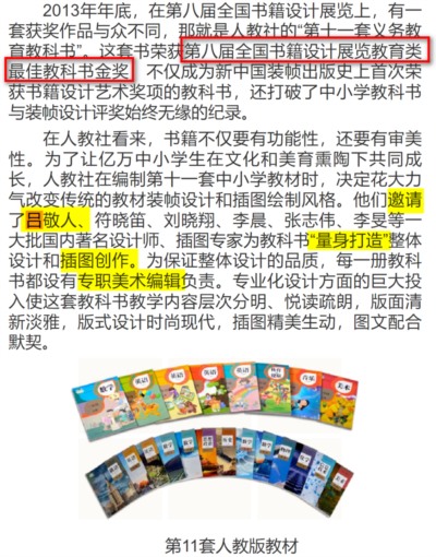 但是在人教社自己的文案里,都没提到吴勇的名字,而是提到「邀请」了吕敬人为教科书量身打造插图创作,然后吕敬人也拉上自己的弟子吴勇和孩子吕昱参与设计,显然不是招投标,而是个「双赢」项目,一个抢出了教材编制时间,一个拿到项目和名声,还能带带子侄。