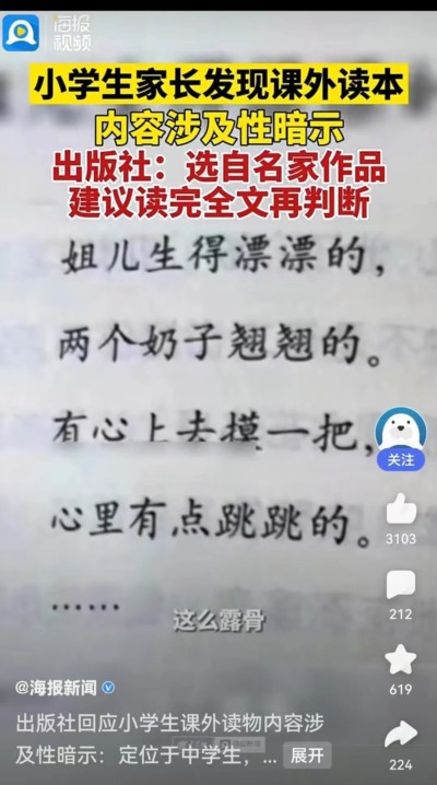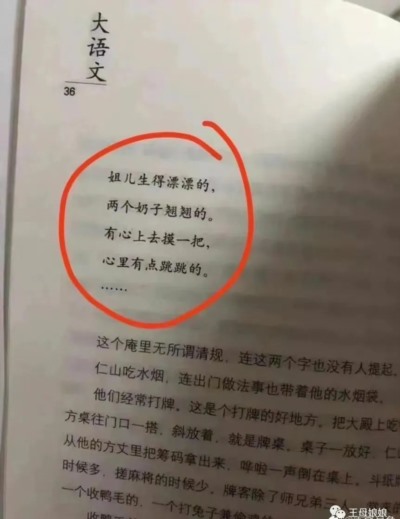 上下五千年的中华文明,难到没得选了吗?没有名家了吗?为什么偏偏要去选一篇露骨的色情描写给小学生。这个名家有多厉害,难道他作品经历过了上百上千年的岁月历练、时空筛选?知道他的人有多少,知道他作品的人又有多少?难道我们的道家、儒家、法家、医家、兵家、墨家、阴阳家、纵横家里面选不出一篇名家的作品,非得选这么黄的内容进小学课堂。出版方、编辑部是在选名家还是在选自家?还是在选“圈子”文化进入课堂,你敢摸着你们的良心来回答一下?就是选名家,你们觉得选这样的内容对学生,还是小学生,合适吗?你们还有没有底线?金瓶梅还是名著呢,为什么不选?
