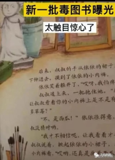 从人教插图到书本内容,都是这个风格。这真是千古奇观,课本不是引导孩子树立正确的人生观,不是以天下为己任,经世济民的思想为抱负,而是引导培养我们的孩子从小对色情和暴力产生兴趣。还能一步步通过监管:从编辑、主编、审核、再到签字出版都是一律通过。不是没人反映,而是反映了根本就没人鸟你,前面有知名童话家郑渊洁早年反映掀不起浪花,后面有清华教授反映无人理采。更别提家长。家长对学校对老师而言,向来就是弱势群体,家长怕得罪了对方给自己的孩子带来不利,而选择忍气吞声和保持沉默,如同学校强制购买课外读物一样的道理,都是敢怒而不敢言。
