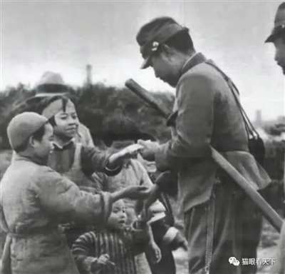 这张照片是日本的《大阪每日新闻》和《东京日日新闻》的记者于1938年11月在中国“拍摄”的,最初它刊登在侵华日军宣传画报上,随后在日本本土以及国际一些媒体上发布。其目的也很明显,就是美化侵华战争。与此相类似的照片还有不少,比如侵华日军给中国小孩子送糖吃。稍微有点脑子的人,都知道这些照片是怎么一回事。