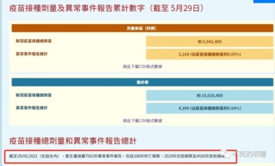 2.截至2022年5月29日,香港卫生署共接获7563宗异常事件报告,包括108宗死亡个案,2529宗住院个案,即4926种其他个案。