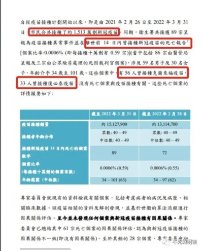 披露一份香港疫苗接种后的死亡数据