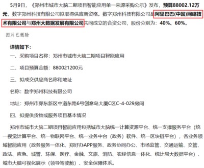 中标方是阿里巴巴与郑州大数据发展有限公司成立的合资公司数字郑州科技有限公司(占股分别为40%与60%)。