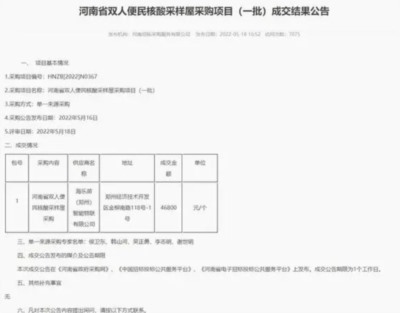 就这样一套“中看不中用”的核酸检(铁)测(盒)屋(子)造价还不低。据河南省政府采购网公示,供应商为海乐苗(郑州)智能物联有限公司,中标单价为46800元。采购人为河南省工业和信息化厅,采购代理机构为河南招标采购服务有限公司。