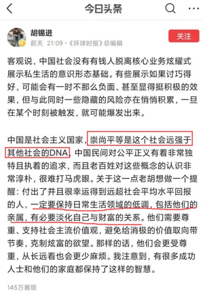环球时报前总编胡锡进这一次又跳出来向高官和富人们喊话: