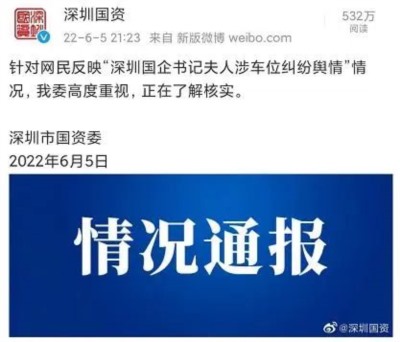 虽然,深圳国资委在5日晚已经通报称,“针对网民反映‘深圳国企书记夫人涉车位纠纷舆情’情况,该委高度重视,正在了解核实。”