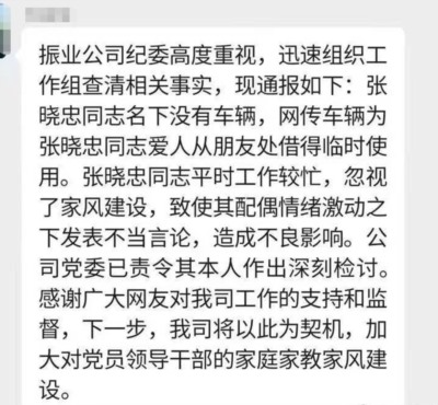张晓忠同志名下没有车辆,网传车辆为张晓忠同志爱人从朋友处借得临时使用。张晓忠同志平时工作较忙,忽视了家风建设,致使其配偶情绪激动之下发表不当言论,造成不良影响……