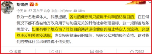 胡主编大半夜发文,如果哪个地方政府为了防疫以外的其他目的调控健康码,阻止人们出行,这是违反相关防疫法规的。