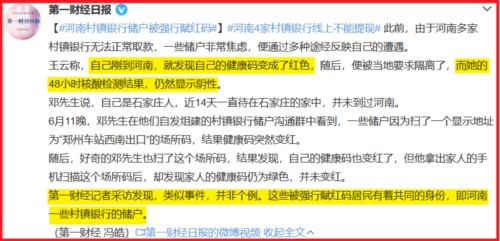 就个人而言,给储户赋红码,阻止出行取钱,这是我今年甚至去年听到过的最离谱的事情,嗯,应该没有之一。