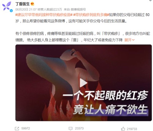 这一次的文案是著名的丁香医生做的,不得不说,文案写得很好,视频拍得也很生动,成功地贩卖了焦虑,还打的感情牌(孝心),自然就会有很多人被打动(道德绑架)。——可以肯定地说,这一波热搜过去,会带来不少带状疱疹疫苗接种。