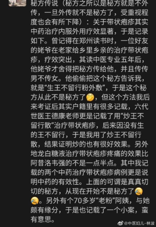 还有一些民间验方。比如微博博主@中医妇儿-林波在6月2日的一则博文就分享了一个治带状疱疹的验方。在他这条博文的评论中,还有网友分享了一些其他的验方。