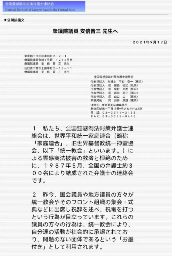 而早在2019年与2021年,日本某律师协会就多次致信安倍,称“统一教”就是一个压制信徒人权、压榨信徒金钱、破坏信徒家庭的“反社会团体”,并有着渗透政坛的野心,呼吁安倍不要与他们来往,参加他们的活动。