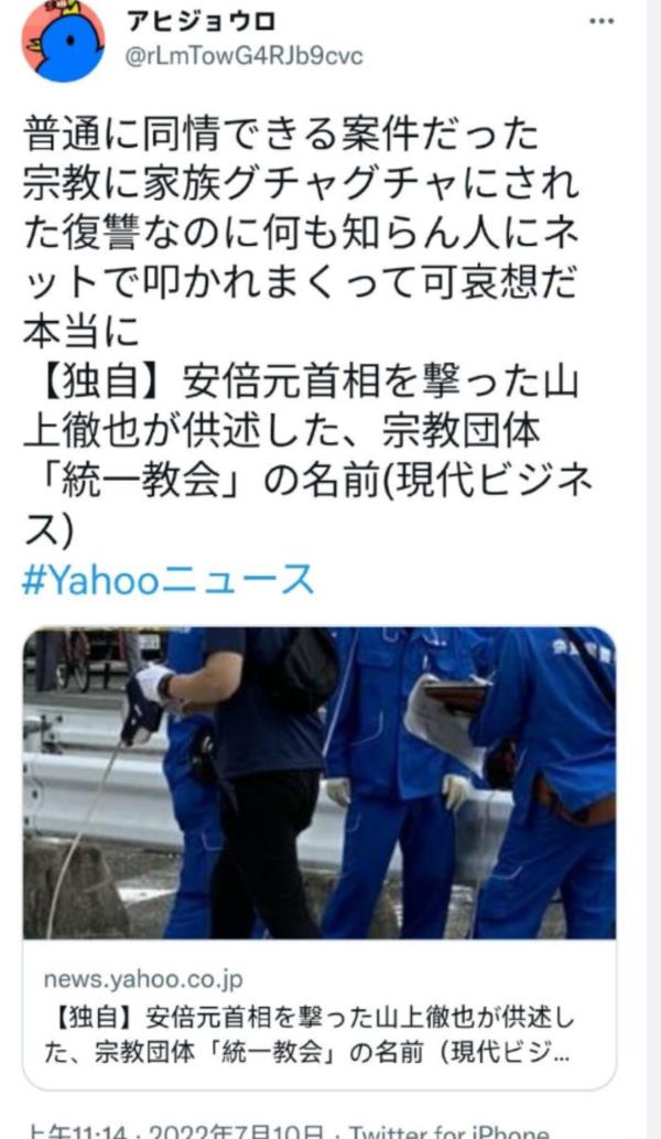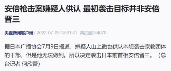 7月9日,日本警方透露称,山上彻也对某宗教团体的怨恨演变成对安倍的杀意。