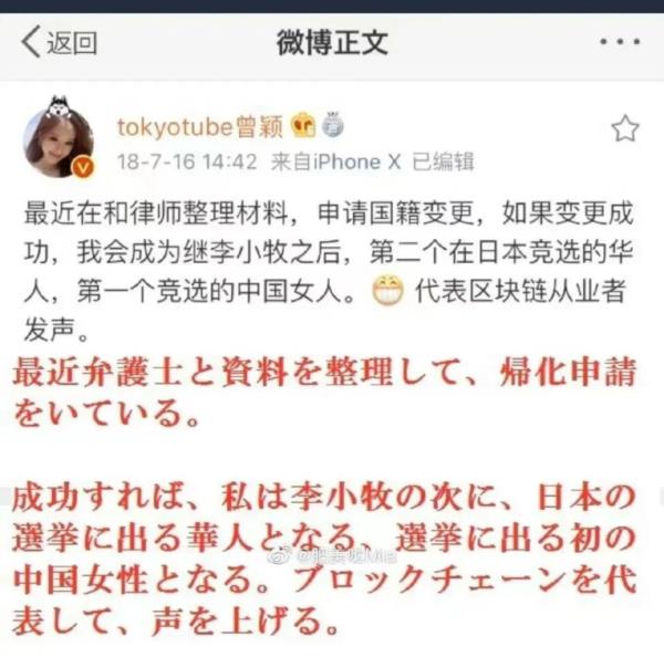 答案可能就在她在日推上被“精日”扒的黑料中。在她以“tokyotube曾颖”名字注册的境外账号里,有这么一段文字,说她要加入日本国籍并要参加日本选举,要成为“第二个在日本竞选的华人”“第一个(在日本)竞选的中国女人”。
