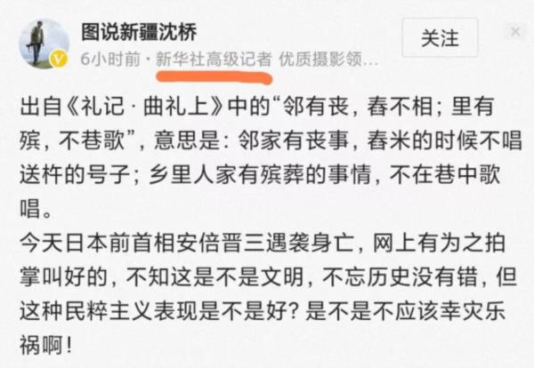 特别是那位“大明白”的“老新闻工作者”,要把中国与安倍之间的“政治纠葛”放在一边,要“抛开中日纷争不谈”,表达对安倍本人的同情。