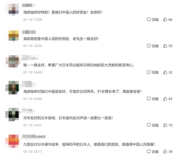 今年1月份,日本前首相海部俊树去世,中国网民对其评价很正面,而且予以缅怀。