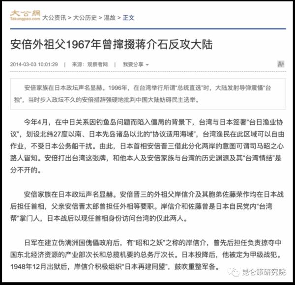 2.1997年,安倍晋三在接受《政界》杂志采访时赤裸裸地坦承,“被称为未来的‘台湾帮’的一员也无所谓。1960年的《美日安保条约》明确规定台湾属于其防卫范围,如果将台湾排除在美日安保的防御范围之外,那将十分危险。”