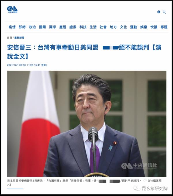 10.2021年12月1日,安倍晋三受台湾“国策研究院”邀请,发表关于“新时代台日关系”的演说。他表示日本无法容忍台湾“遭武力侵犯”,并称“台湾有事就是日本有事,也可以说是等同于日美同盟有事”。他认为“台湾周边面临的挑战与‘尖阁诸岛’(钓鱼岛)等‘日本的领土’所面临的挑衅没有两样。我们必须超前部署,防范中国从空中、海上、海地不断进行的各种军事挑衅。”他最后警告中国“绝对不能误判形势。采取‘军事冒险行动’等同于走向经济自杀的道路”。