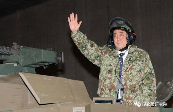 【2013年4月27日,在日本千叶的一次集会上,首相安倍晋三身穿迷彩服、登上坦克,三呼“天皇陛下万岁!”】