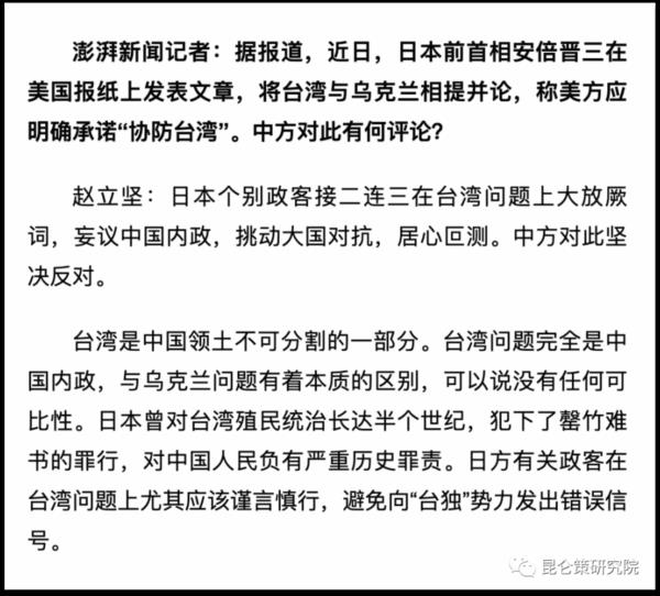12.2022年4月12日,安倍晋三在美国媒体发表文章《美国必须结束在台湾问题上的战略模糊》,将台湾与乌克兰相提并论,称美方应明确承诺“保护台湾免受中国‘入侵’”。