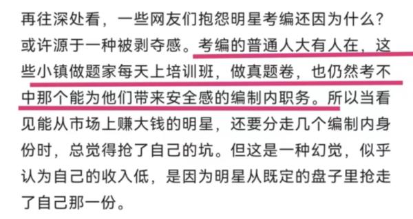 其实也不是说明星不能赚钱,明星不能考编,而是我们普通人凭什么不能质疑?凭什么一质疑就变成了他们口中无能的“小镇做题家”?