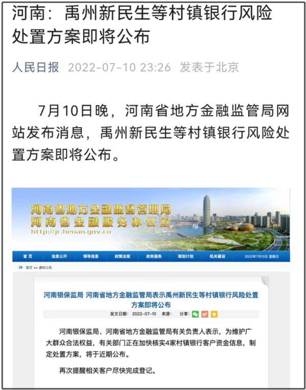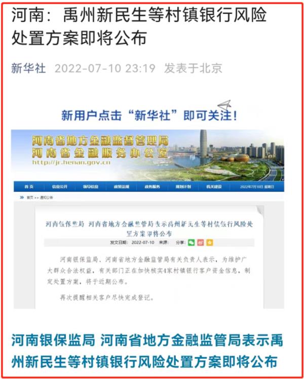 昨天事件发生后,人民日报和新华社在晚上十一点之后,转发重要信息:禹州新民生等村镇银行风险处置方案即将公布。