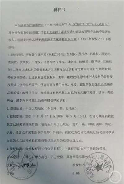 更加荒唐的是,《谭谈交通》节目竟然在电视台停播数年后,由成都电视台将相关权益完全授权给了成都游术文化传播有限公司。网络披露的相关文件显示,游术公司将取得维权诉讼的60%的收益。