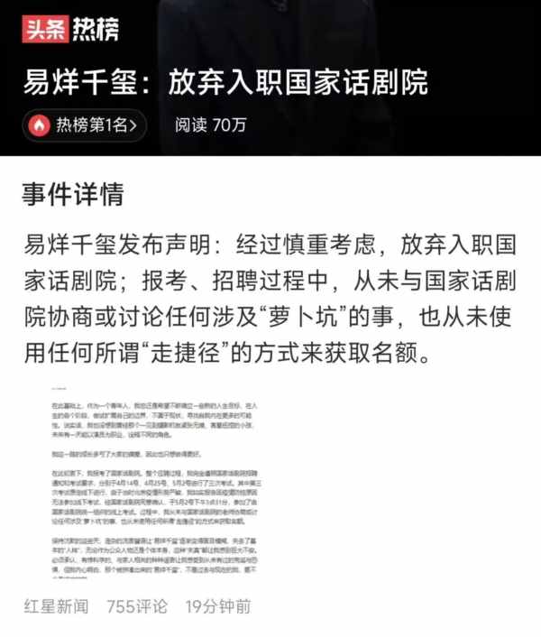 而今天的新闻里,连易洋千玺也认怂放弃入职了国家话剧院。