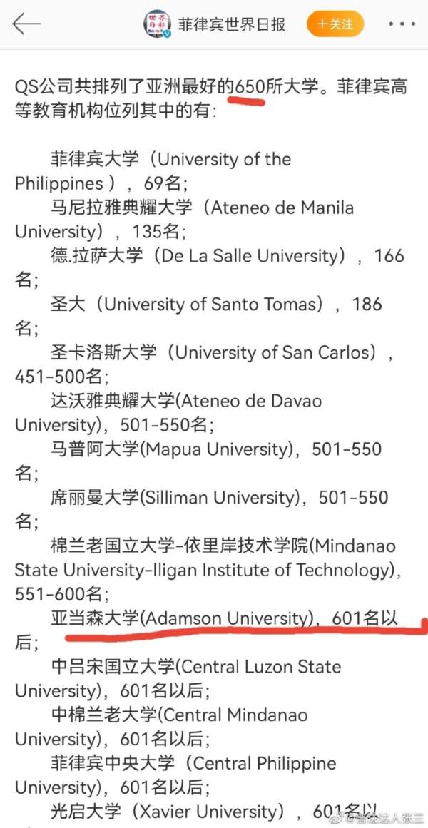 在2021年QS公司亚洲大学排名中,菲律宾亚当森大学排名600名以后。虽然排名不一定完全反映各高校的实际情况,但总归是有些参考性的。