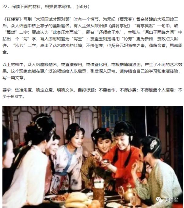 我就想问一句,有多少孩子读过红楼梦?怎么高考作文不写写乡下怎么种地,不写写城里工厂怎么做工,不写写大街上的事情?这些场景都是中国孩子们日常接触的东西。为什么不写百姓家的事情,非要写《红楼梦》的段子?