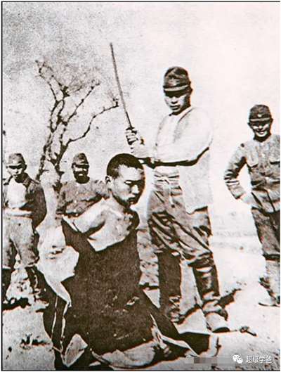 有一幅著名的历史照片,一个头戴军帽,身穿白衬衫的日本军官,正举刀向跪在地上的中国青年砍杀。此人,就是田中军吉。