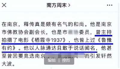 这位传真法师俗名李义将,1987年9月在栖霞寺出家,1990年10月在常州天宁寺受戒。现为南京玄奘寺、溧水无想寺、泗阳天后宫住持,南京市政协委员、江苏省佛教协会理事、南京市青联常委、南京市佛教协会副会长。你说他是和尚,不如说他是社会名流、大老板......他还筹拍过“抗日电影”《栖霞寺1937》《三藏塔1942》,你觉得他会不认识日本战犯的名字?