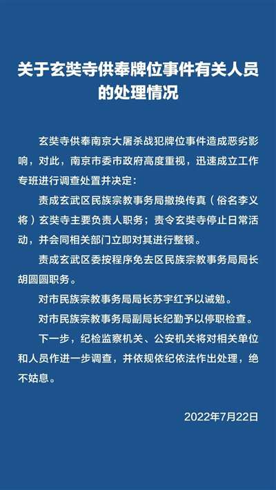 南京市委市政府也做出了快速的反应,迅速成立了工作组,进驻玄奘寺,处理了一批主要负责人……并且表示“一查到底,绝不姑息”。