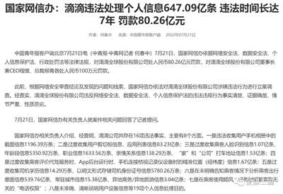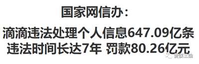 网信办:滴滴违法处理个人信息647.09亿条违法时间长达7年罚款80.26亿元