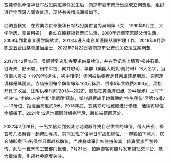 昨天,玄奘寺供奉日军战犯事件的调查结果出来了。