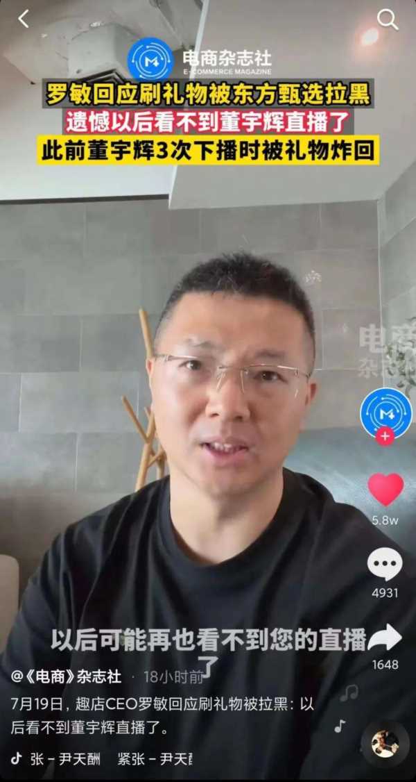 在直播的打榜文化里,这是一个常规操作,重金砸到榜一,在一个大流量的直播间里,你的名字就会像贴片广告一样挂在屏幕右上角。 罗老板这波豪横的操作,立刻带歪了直播间的节奏,这一看就是来抢流量的。 董宇辉也毫不客气,把一堆农产品摆到桌子上,建议这位土豪别刷礼物,买点农产品,送给员工,积德行善。临走留下一句话:“我先下班了,哥你慢慢买。” 然而没多久,罗敏的账号就被东方甄选拉黑,后来董宇辉解释:“导演小哥因为大学刚毕业,有时候有些私人恩怨,他要拉黑,我听完之后觉得挺合理的。” 这段话显然是暗藏刀锋的,一个大学生和罗敏能有什么私人恩怨? 除了学生贷还能有什么。