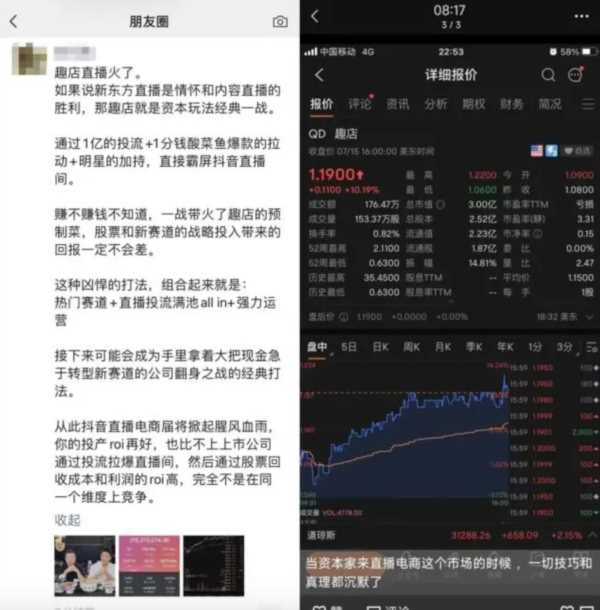 这波带货,效果空前,在7月17日一场长达19个小时的马拉松一般的直播里,他成功吸引了9000多万人观看,卖出了956万份预制菜。而“趣店罗老板”的抖音号,粉丝一天时间暴涨397万。 最给力的是趣店的美股股价,次日收盘,市值涨了1.67亿美元,轻松覆盖了这波造势的所有成本。 罗敏在抖音大盘上几乎接棒6月东方甄选的热度,成了平台的七月“当红小生”。