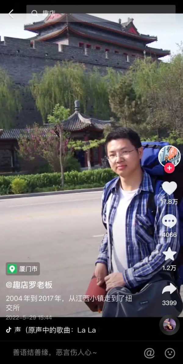 为了预制菜大业,罗敏确实是挖空了心思。 在今年5月份,他就开始在抖音上精心打造起一个励志人设。在他最高赞的短视频里,一个从学生装扮的青涩青年,摇身一变成为站在纽交所门外的成功人士,视频配文:2004~2017年,从江西小镇到纽交所。(最近可能是骂他的人太多,罗老板删了这条置顶作品)