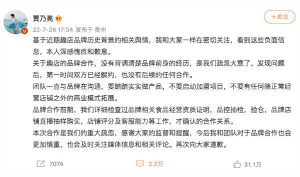 董宇辉直播间的拉黑,似乎吹响了舆论对罗老板的“围剿”,就连和他在预制菜直播中并肩作战的明星们,也开始撇清关系。 从7月26日中午开始,助阵罗老板直播间的傅首尔和贾乃亮先后发布声明,称这起合作未进行详细背调,本人深表歉意和愧疚。 真是大难来临各自飞。