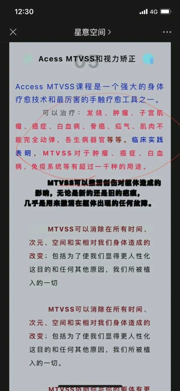 该组织名为Bars的课程,据其所称是一种手触疗法,“用手轻触头上的32个点位,就能释放头脑和身体中的旧能量,实现巨大且轻松的改变,如脊柱侧弯消失且身高增加、须手术治疗的脚趾变形自然恢复,以及身体各种疼痛缓解或消失。