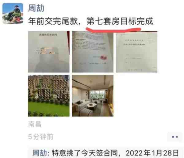但周劼的朋友圈,价值千万的大别墅,豪华装修、买房合同、大红手印,证据齐齐全全明明白白至少七套房。